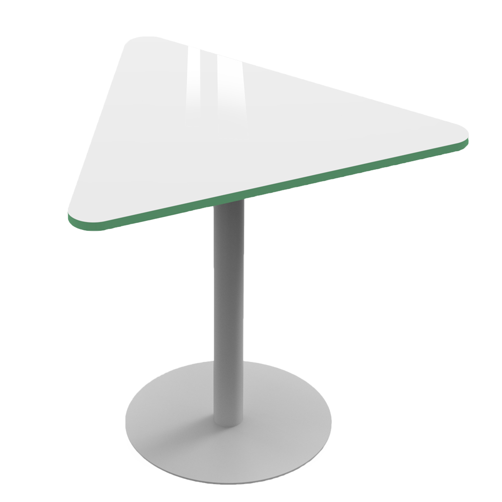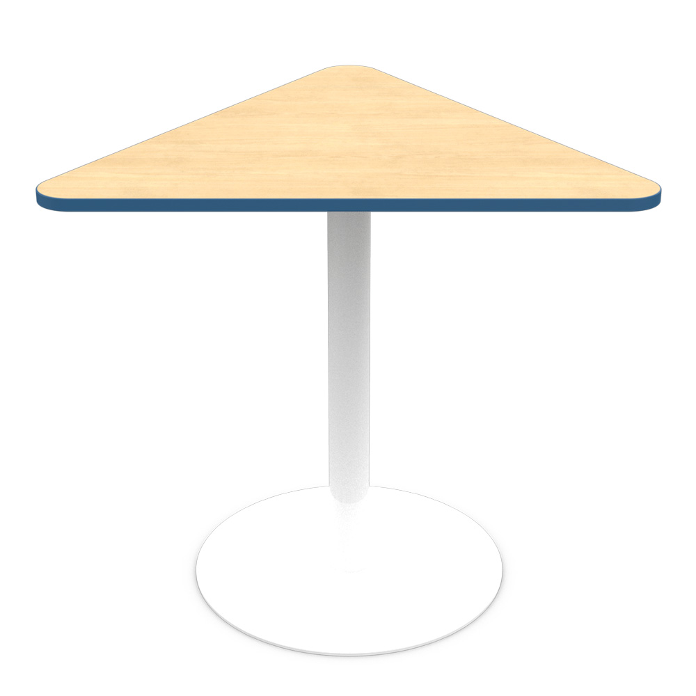 The Triangle Table brings clarity and efficiency to compact learning and collaboration spaces, using a simple geometric form to create a surprisingly versatile footprint. Its triangular surface naturally supports small‑group interaction, encouraging students or users to gather, face one another and share resources without crowding the space. The single column base keeps the table visually light and open, allowing chairs to move freely around it and making the piece feel unobtrusive yet purposeful.