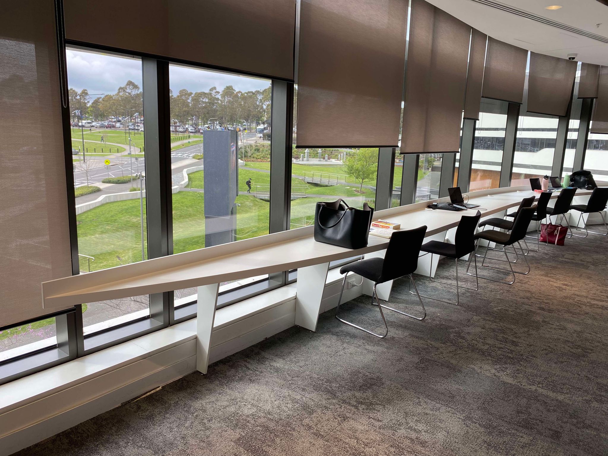 A curvy bench has been extended at Bunhill Place Library with accessible power to each spot making studying and charging outside of home so much easier. The bench discretely curves its way around from one end of the library to the other and is tucked away in a quiet, hidden area.